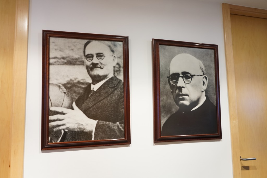 En reprenant le couloir pour retrouver la salle principale, mon regard s’arrête sur deux portraits côte à côte, autant mis en valeur l’un que l’autre. Celui de gauche, on ne le présente plus, c’est grâce à lui que l’on partage cette passion aujourd’hui, James Naismith. L’autre, c’est celui qui a fait découvrir la balle orange à la Catalogne, le père Eusebio Millàn.