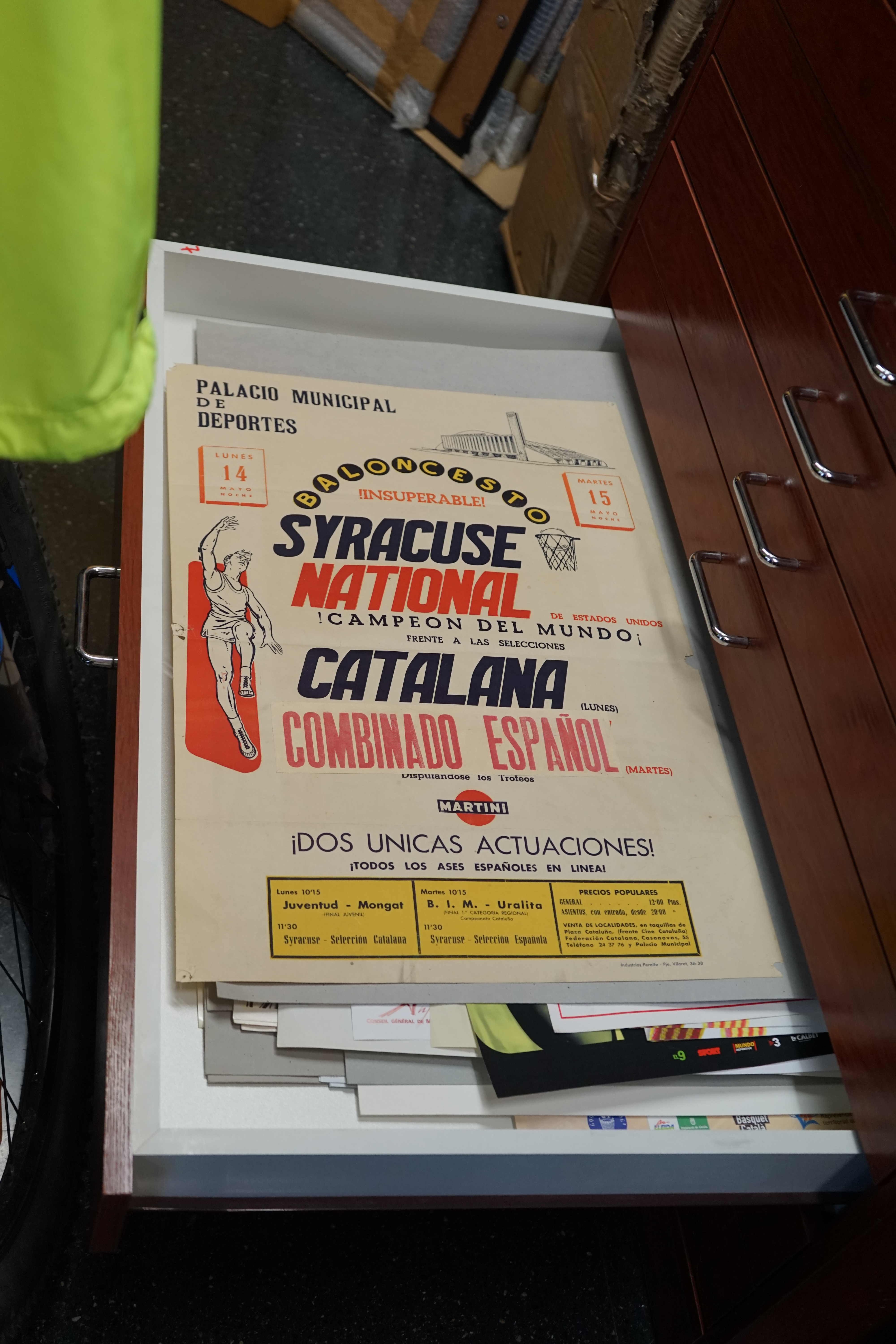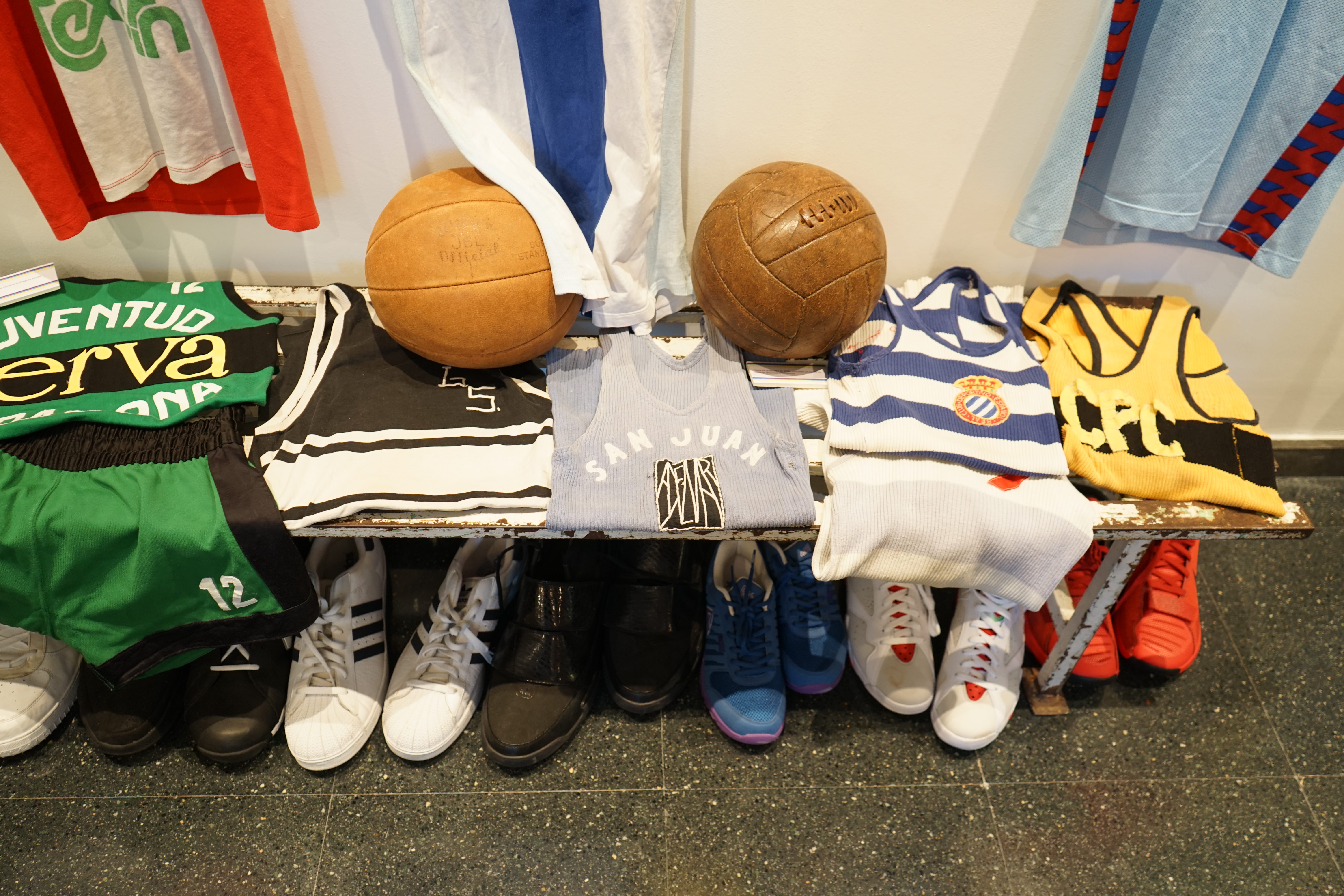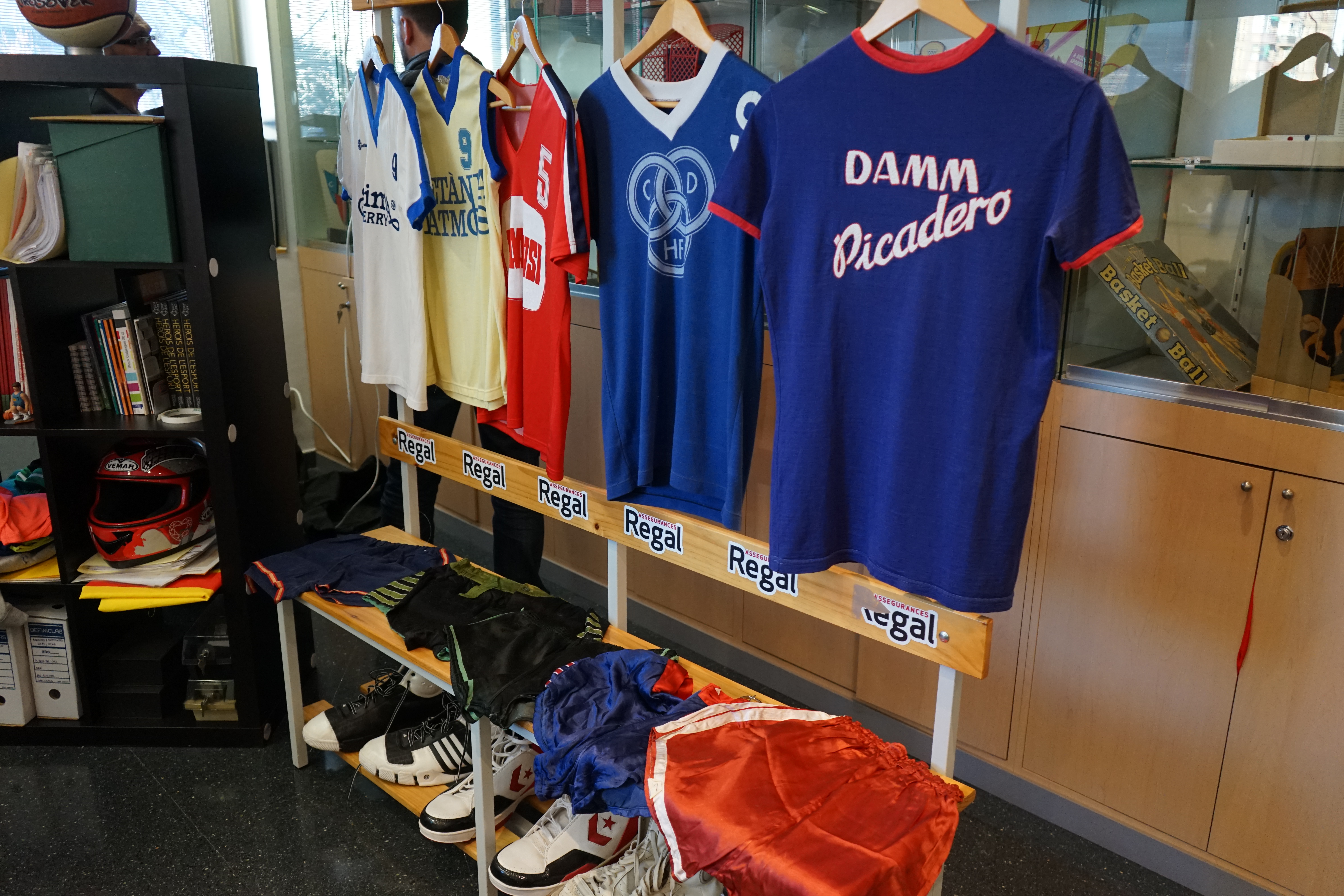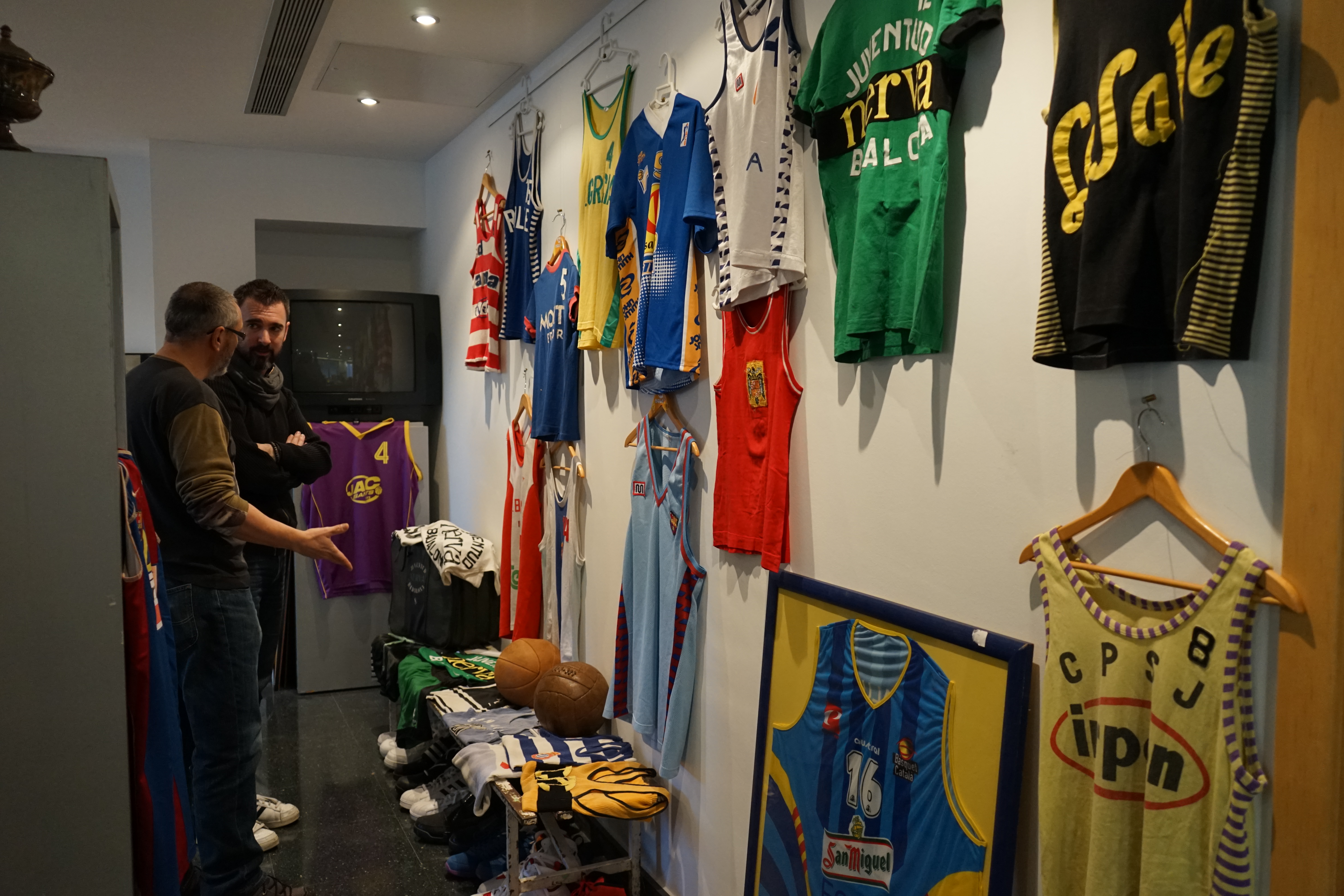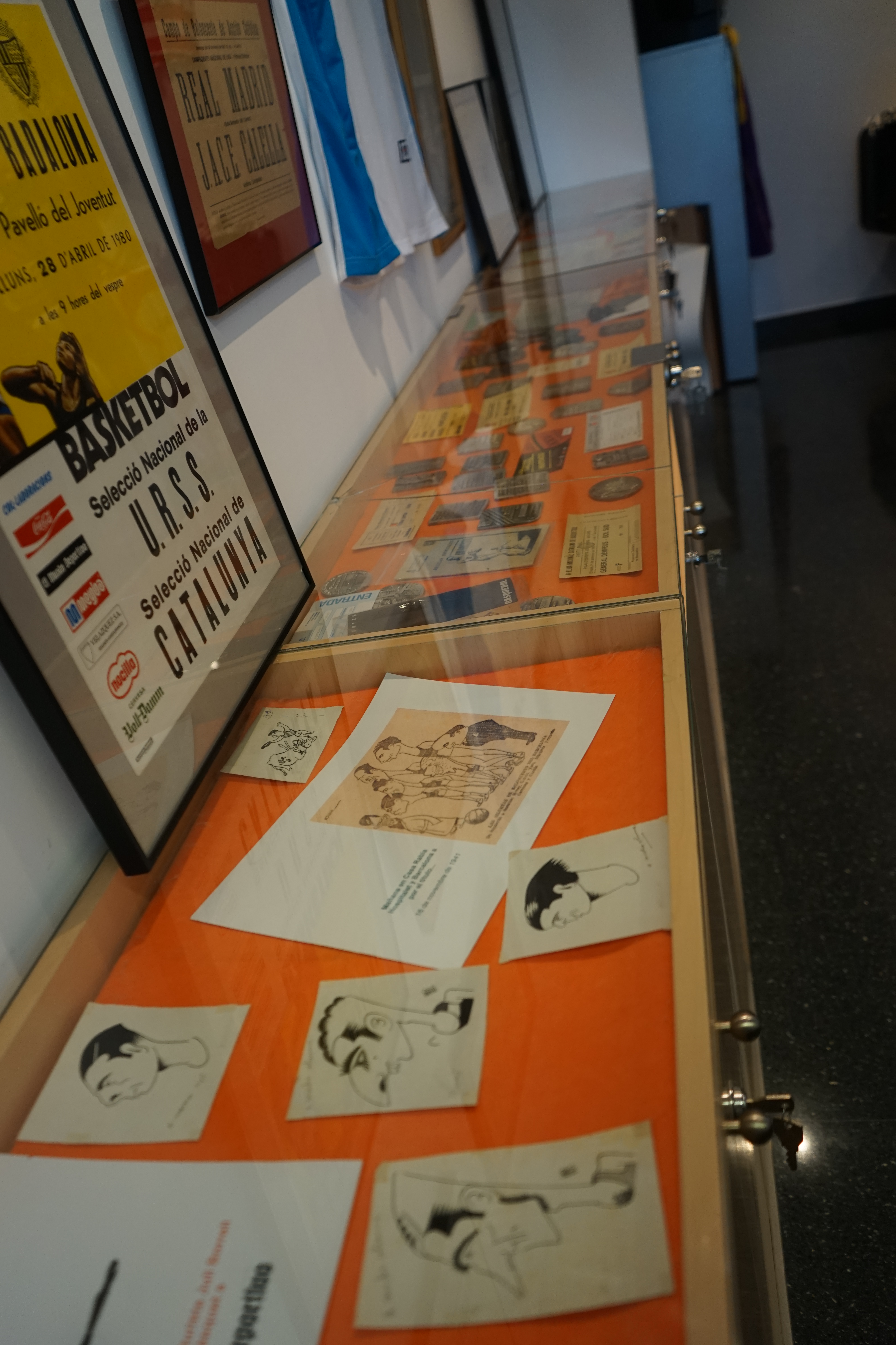 Egalement, des objets de collection comme des ballons, chaussures mais aussi des maillots originaux de nombreux clubs. On reconnaît certains immédiatement comme le vert et noir de la Joventud Badalona, on en découvre d’autres de clubs parfois disparus. Plusieurs affiches ou places de matchs sont exposées, dont un savoureux « sélection nationale d’URSS » contre « sélection nationale de Catalogne » daté de 1980. Les Syracuse Nationals, ancêtres des Philadelphia 76ers sont également venus jouer dans les années 60 contre des sélections espagnoles et catalanes comme en témoigne une autre archive.