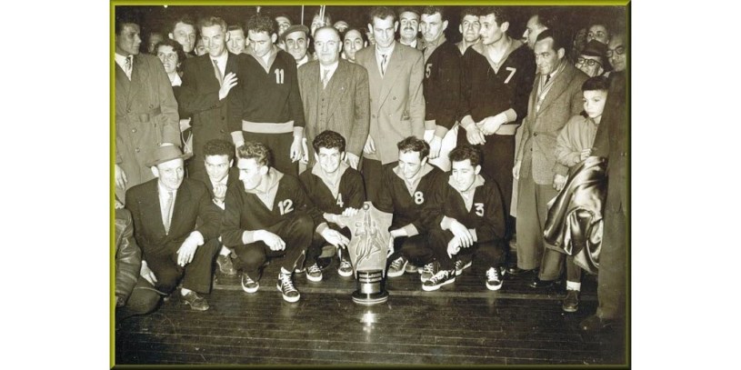 1956 : la victoire en Coupe de France. Devoti (n°4) pose devant le trophée. @les amis de l’histoire d’Auboué