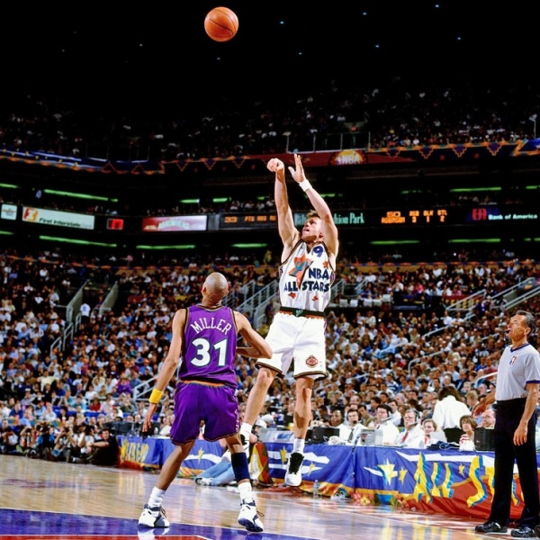 Malgré un temps de jeu revu à la baisse et des stats offensives un poil moins performantes, Dan Majerle retrouvera le All-Star Game pour son édition de 1995, et en plus en tant que titulaire. Le fait que la grande messe se déroula à Phoenix cette année là ayant surement joué dans la balance au moment des votes. Quoiqu’il en soit, lors de cette même édition, «Thunder» prendra sous son aile le jeune MIKE HOBAN, candidat de 16 ans au shoot à 1 million de dollars. Dan Majerle entrainera et accompagnera le Kid jusqu’au moment fatidique, prouvant ici qu’il était un homme de valeurs.