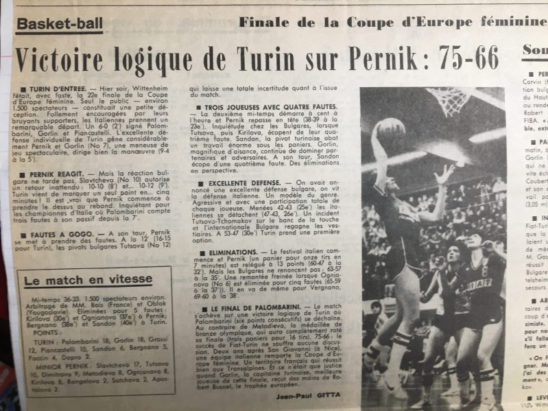 C’est à Lidia Gorlin, la reine du match, que Robert Busnel, président de la Standing Conférence of Europe de la FIBA et encore président de la FFBB pendant quelques jours avant de transmettre le flambeau à Robert Founs, remet la Coupe : « C’était un très beau match. Turin a fait preuve d’une grande intelligence de jeu, déclare le président. Les Bulgares se sont empêtrées sous les paniers à vouloir jouer sans cesse sur les grandes, sans prendre de risque à mi-distance. »