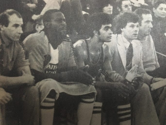 13 janvier 1979 – Le banc de touche manceau à Mulhouse. Bill en cravate. A sa gauche, Christian Baltzer, le président, à sa droire, Olivier Veyrat, Bill Cain et Claude Gasnal. @DNA