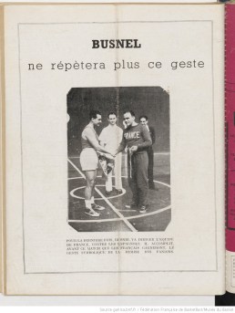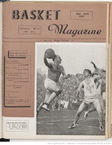 Le numéro de mai 1948 de Basket Magazine édité par Robert Busnel avec une phase de la finale du championnat gagné par André Buffière, avec l’UA Marseille (à droite) face au Championnet de Henri Lesmayoux (à gauche).