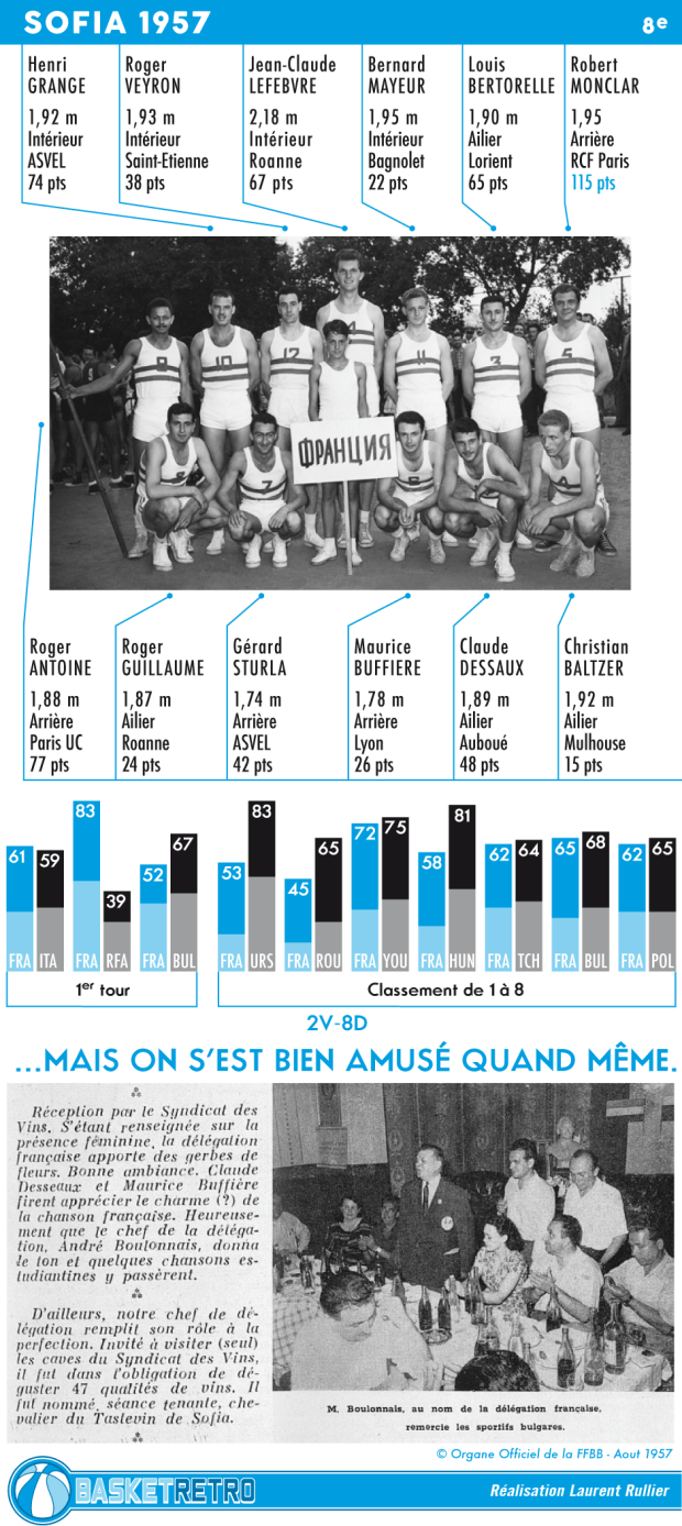 Seul Robert Monclar, malgré un retard à l’allumage en début de tournoi, réussit à prendre le dessus. Le tout jeune Jean-Claude Lefebvre montra également de belles choses à l’intérieur sans faire oublier complètement le grand absent Jean-Paul Beugnot qui soutint de loin ses camarades en leur faisant parvenir un message d’encouragement après la victoire du premier tour contre l’Italie (61 à 59).