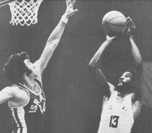 Le shoot soyeux de Jacques Cachemire face à l’Israélien Eisner à Vienne – © Equipe Basket Magazine, oct.1973