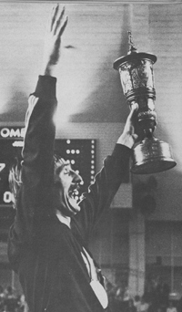 A la fin c’est Turdic qui soulève le trophée. Une première pour les Yougos – © Equipe Basket Magazine, oct.1973