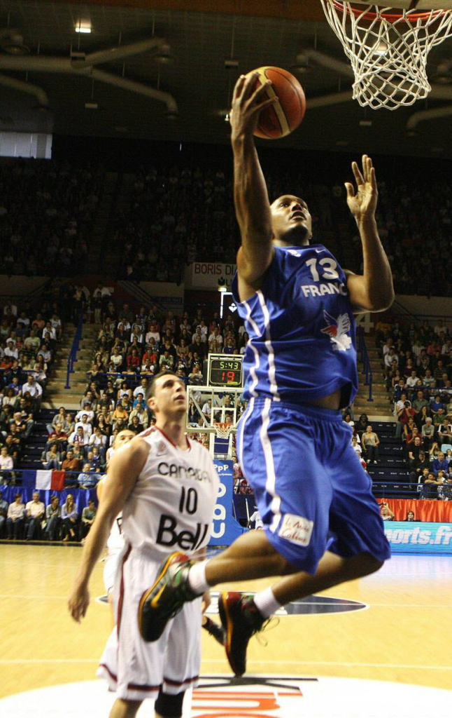 14 Septembre 2011 : Quart de finale face à la Grèce, malgré le bon parcours lors des phases de poules tout peut basculer. La sélection Grecque reste un mauvais souvenir pour les bleus présents à l’Euro 2005 qui se sont fait crucifier en toute fin de match par un shoot à 3 points de Diamantidis alors, qu’ils menaient de 7 points à 45 secondes de la fin. Ce quart de finale est l’occasion d’exorciser ce mauvais souvenir. En début de match les joueurs français semblent absents, ils se font contrer en attaque et défendent mal. Logiquement, les bleus sont menés à la mi-temps. Le sélectionneur choisit d’élever la voix pour remotiver ses troupes. Effet immédiat, les joueurs relèvent la tête, Nando De Colo plante un shoot à 3 points en début de seconde de période pour recoller au score. La France reprend alors confiance et à l’instar de Joakim « Raging Bull » Noah qui prends un rebond offensif au cœur de la défense grecque pour aller ensuite claquer un dunk surpuissant, les français reprennent confiance. A 1 minute de la fin, grâce à un shoot de Nicolas Batum la France mène de 4 points. La France remportera finalement le match 64 à 56 et lave l’affront de 2005.
