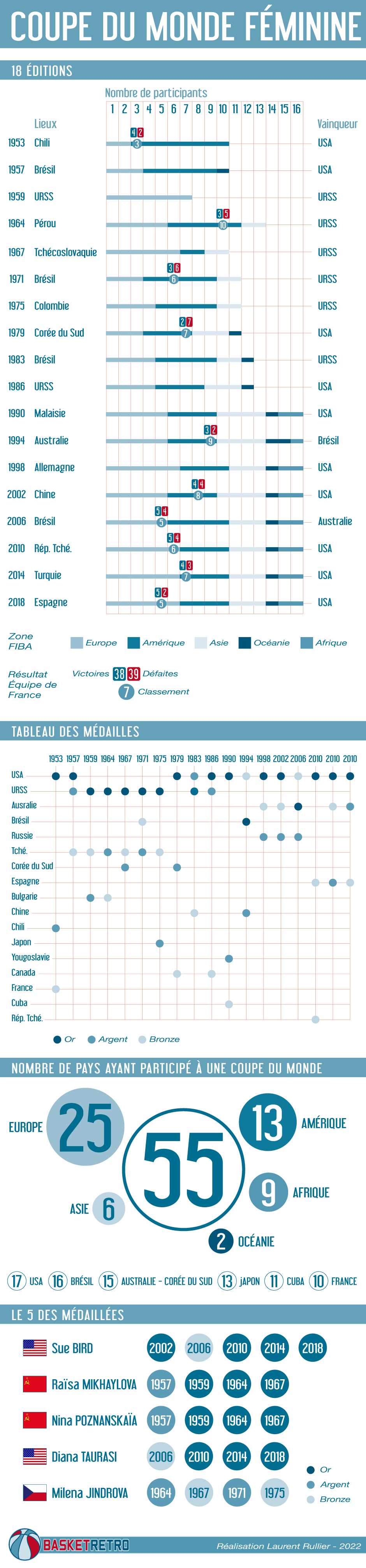 NB: Avant la création du championnat du monde féminin par la FIBA, il convient de rappeler que la France a remporté l’épreuve de basketball des Jeux Mondiaux féminins 1934 à Londres (victoire 34-23 face aux Etats-Unis pour les partenaires de Lucienne Velu). Il s’agissait alors de la 4ème édition de cette compétition multisports initiée dès 1922 par la française Alice Milliat, en réaction au refus du CIO d’intégrer le sport féminin au programme des Jeux Olympiques. L’équipe de France de basketball était alors placée sous l’égide de la Fédération Sportive Féminine Internationale.