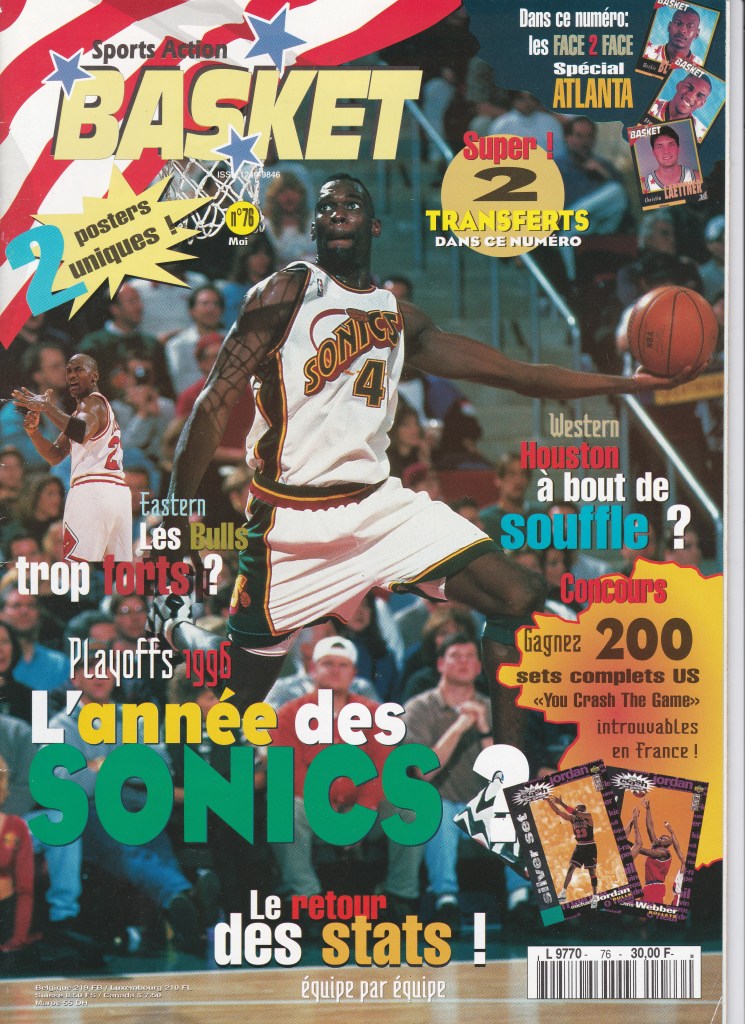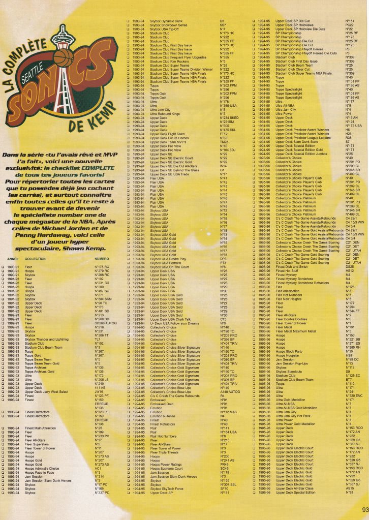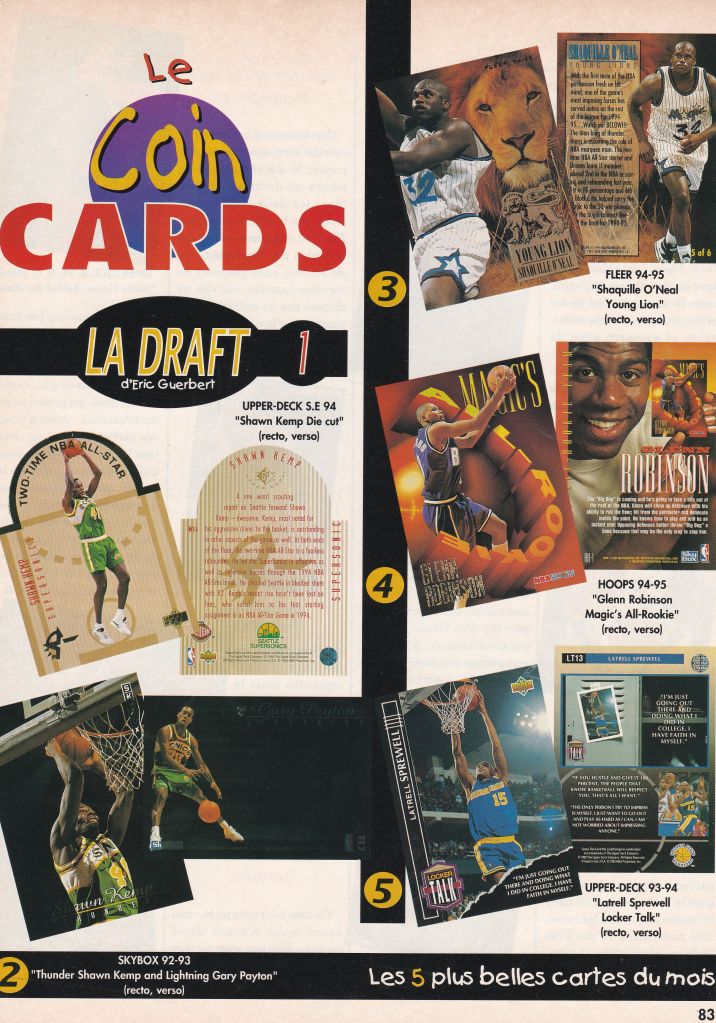 Nous espérons que vous n’avez pas le vertige car la carte du mois concerne un voltigeur de première dans les années 90, nous avons nommé Shawn Kemp ! Sa démarche si particulière (2m08 !) va faire de lui un des dunkeurs les plus adulés des fans du monde entier. La France n’échappe pas à la Kemp mania puisqu’on le retrouvera rapidement un peu partout, dans la presse, sur les posters -grandeur nature- et bien évidemment sur les cartes.