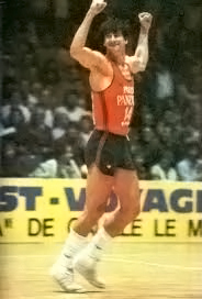 Saison 83/84, On croise encore Alain Gilles en short (une petite pige de deux matchs avec l’ASVEL dont il est l’entraîneur) et il doit être le seul à encore cumuler le basket avec une autre activité. Jacques Monclar, Hervé Dubuisson et Richard Dacoury sont toujours des purs et innocents jeunes hommes, c’est dire que l’époque date! Certaines équipes présentes dans le Championnat de France de Nationale 1 sentent bon les livres d’Histoire: Le Stade Français, Avignon, Tours, Caen, Challans et Orthez (sans Pau). Année faste pour Limoges qui va réussir le doublé en Championnat sous la houlette d’un américain qui cumule à la fois une drôle de moustache et un drôle de shoot: Ed Murphy (meilleur marqueur du championnat avec 32.3 points par match à 61.9% de réussite) bien alimenté en ballons par un meneur vétéran et blondinet: Jean-Michel Sénégal (meilleur passeur avec 9.5 passes). La ligne a trois-points n’est pas encore apparue en Europe, elle ne sera tracée sur les terrains que l’année prochaine après les J.O de Los Angeles. Les J.O, une compétition importante pour l’équipe de France qui n’a plus participé à cette compétition depuis les Jeux de Rome en 1960. L’un des joueurs de cette équipe s’appelle Eric Beugnot.
