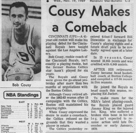 L’arrivée de Bob Cousy à Cincinnati suscite l’intérêt des observateurs et la curiosité des fans. Bien qu’il soit à la retraite depuis 6 ans, il demeure toujours dans les mémoires comme un des meilleurs joueurs de la ligue, il est encore une star. Le magicien déjà observé de près réussit l’exploit d’attirer encore plus les projecteurs sur lui. En effet, il annonce son retour sur les parquets en tant que joueur, la surprise est énorme et fait grand bruit !