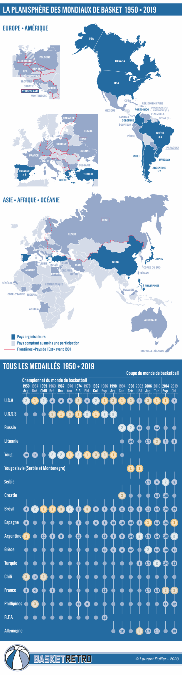 Sur les 61 nations ayant participé au moins une fois à un championnat ou une coupe du Monde, seulement 18 ont connu les honneurs d’un podium. Une planisphère et un tableau des médailles pour réviser votre histoire-géo des Mondiaux basket masculin 1950-2019.