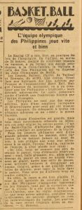 Le public français a d’ailleurs le privilège d’assister, quelques semaines avant les Jeux, à un match d’exhibition et de préparation de la sélection philippine. Le match organisé par le Racing Club de France se déroule à la Croix-Catelan arbitré notamment par Henri Hell. Les Philippins font alors face à une sélection de joueurs français qu’on a pu trouvé ici ou là parmi ceux pas encore en vacances ! Sans doute pour ménager la susceptibilité française, la marque ne fut pas comptabilisée mais Gilbert Bideaux dans son compte-rendu dans l’Auto Journal pointe la domination asiatique. Les Philippins sont vifs et « d’une souplesse incroyable et démoralisants pour ceux qui ont mission de les marquer ». Bref, les Philippines apparaissent au public parisien comme une séduisante équipe de basket-ball.