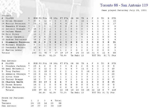 Ainsi donc, pendant cet été 2001, il porte le maillot des Raptors. Le bilan Canadien lors de cette quinzaine sera très contrasté, 2 victoires pour 4 défaites et les stats du Poz, bien qu’honorables ne lui permettront pas de se faire une place dans l’effectif de la franchise. Cependant, lors de son dernier match avec Toronto, face au Spurs (encore) l’Italien (21pts,2 passes) se livre à un duel de haute volée avec un Tony Parker (18pts 14 passes), fraîchement drafté par les Texans. Considéré comme trop vieux, et avec son “prime” déjà derrière lui pour réussir aux Etats Unis, Pozzecco rentre en Italie.