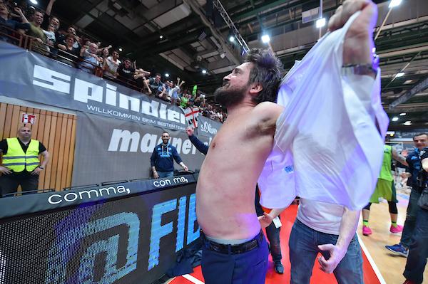 Un entraineur heureux. Gianmarco Pozzecco et Sassari viennent de remporter l’Europe cup en 2019 Photo L.Canu / Ciamillo-Castoria