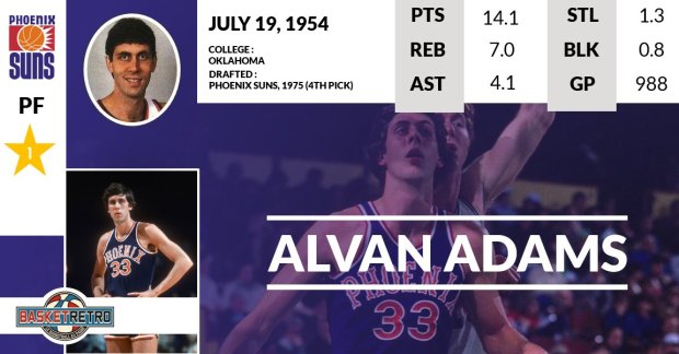 En 1976, Alvan Adams réalise une saison statistique époustouflante pour un rookie. Une consécration individuelle et collective qui retombe comme un soufflé par la suite. Précurseur des point centers comme Divac ou Jokic, il reste l’un des meilleurs passeurs de l’histoire chez les big men. Un boulimique des triple doubles et de la bonne chair. C’est d’ailleurs sa gloutonnerie qui va le conduire à l’une des plus grandes prestations all time chez les Suns !