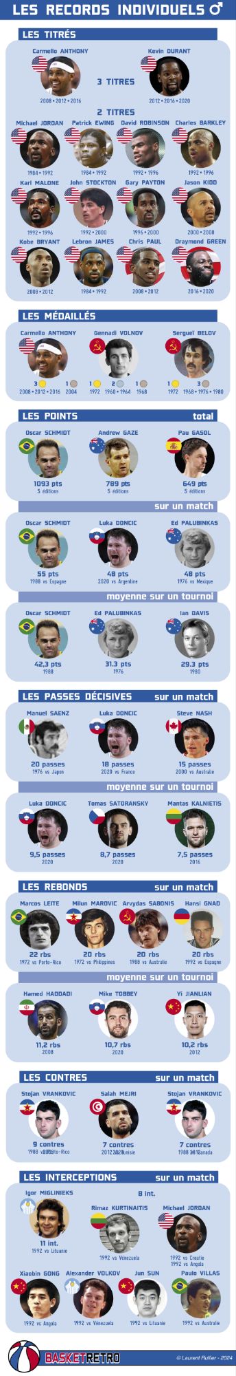 Points, rebonds, passes décisives, contres… Le basketball aime compiler les chiffres pour mettre en lumière un collectif ou un individu. La balle orange a donc ses recordmen/women spécifiques aux Jeux Olympiques. Basket Rétro vous montre ceux des garçons depuis 1936 en une infographie.