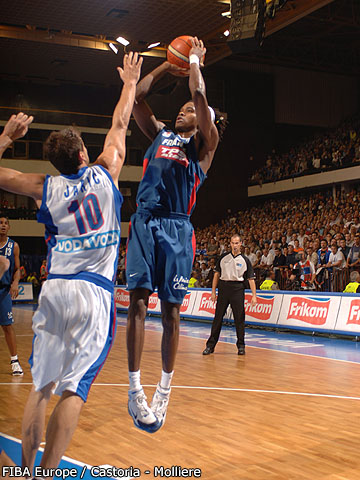Mickael Gelabale au shoot lors du barrage France – Serbie – Euro 2005 (c) Fibaeurope – Castoria-Mollière Mickael Gelabale au shoot lors du barrage France - Serbie - Euro 2005 (c) Fibaeurope - Castoria-Mollière