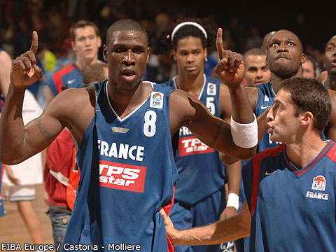 Mickael Piétrus et le reste de l’équipe de France lors du barrage France – Serbie – Euro 2005 (c) Fiba Europe – Castoria – Mollière Mickael Piétrus et le reste de l'équipe de France lors du barrage France - Serbie - Euro 2005 (c) Fiba Europe - Castoria - Mollière