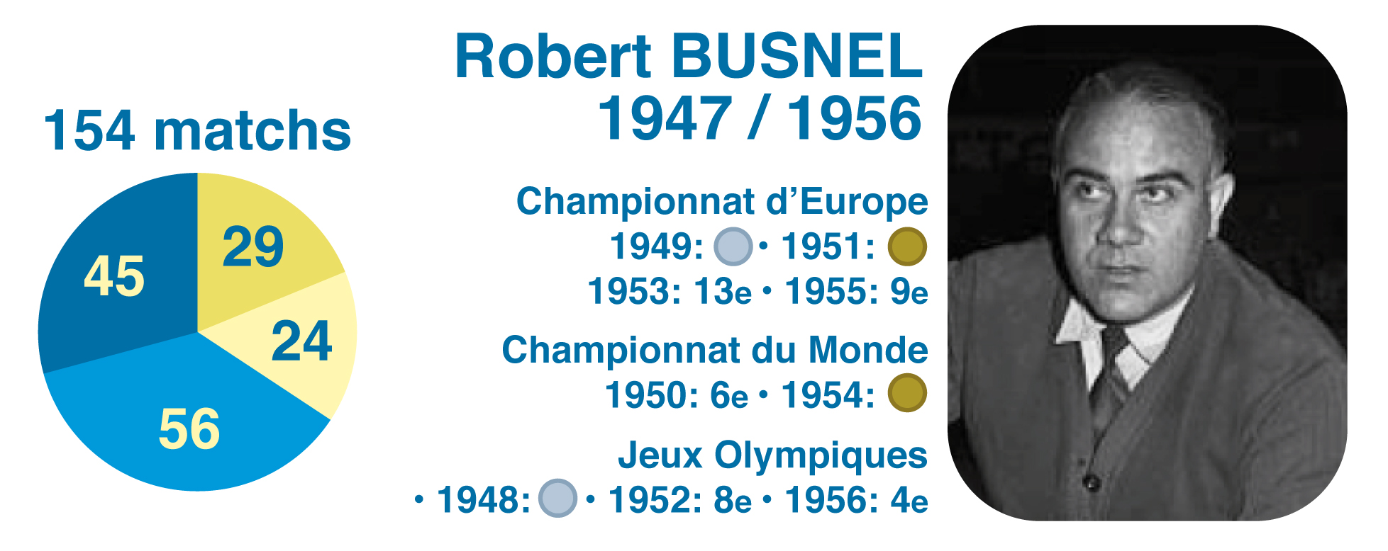 Ruzgis parti, c’est au joueur Robert Busnel, 33 ans, qu’est confiée l’équipe de France. Dans la continuité de son prédécesseur, il innove, corrige, rajeunit l’effectif et surtout séduit journalistes, joueurs et dirigeants. Interdit de jouer aux JO de Londres pour cause d’enfreinte à l’amateurisme (il gère sa propre marque de ballons et chaussures), l’entraineur-sélectionneur-manager, mais pas joueur, se fait remarquer sur le banc de touche en assumant pleinement sa fonction de coach. Récompensé d’une médaille d’argent, le parcours olympique valide la méthode Busnel. Il s’imposera comme la figure marquante du basket français des années cinquante. Après le Championnat d’Europe 1949, il ne s’auto-sélectionne plus. Mais les bons résultats s’enchaînent et l’homme-orchestre Busnel profite pleinement de cet âge d’or. Scolaires et universitaires s’entichent du basket et les salles ne désemplissent pas. Essayiste, théoricien, polémiste et même équipementier des EdF, le coach des Bleus est partout à la fois mais son équipe semble être la seule en Europe de « l’Ouest » à pouvoir freiner l’hégémonie naissante des sélections de « l’Est ». Cependant, la décevante 8e place obtenue aux JO 1952 fait apparaître une opposition qui remet en cause la méthode Busnel. Préparation individuelle sans surveillance, une tournée en Afrique du Nord inutile et le manque de vrais assistants sont mis en avant par des opposants renvoyés au statut de jaloux. Les années suivantes sont plus difficiles pour « Bus », malgré une médaille de bronze au Mondial 1954 sans équipe de l’Est. Mais elles sont bien présentes à Budapest l’année suivante à l’Euro 1955 pour vampiriser le top 10 en ne laissant que la 9e place aux Français. Le manque de préparation, l’absence de cadres, (Haudegand, Antoine), matchs en extérieur… La culture de l’excuse se met en place. Elle perdura durant de longues années. Mais le mal est plus profond. Ses assistants Emile Frezot et Jacques Personne agacés par son fonctionnement autocrate le laissent tomber à quelques jours des JO de Melbourne en 1956.