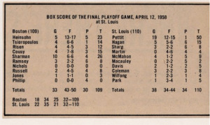 Lors de ce dernier match de la série (4-2), Saint Louis aura donc remporté son premier titre NBA. Et dans le même temps, Pettit va rentrer dans le livre des records, puisque ses 50 points marqués au match 6 de cette finale étaient un record NBA à l’époque, qui sera battu en 1962 par Elgin Baylor avec 61 points marqués sur un match en finale NBA.