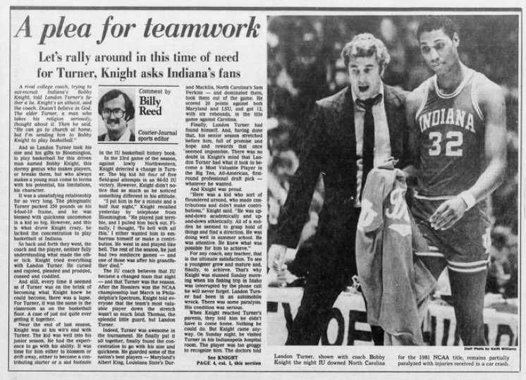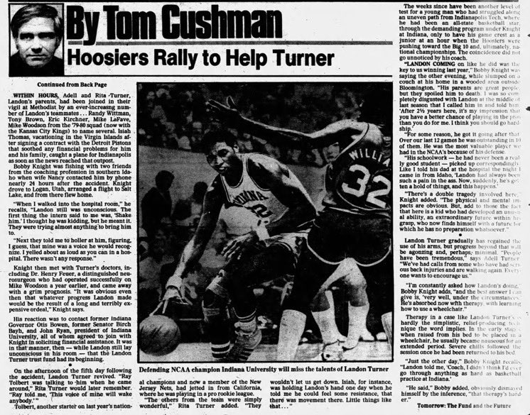 À la suite de cet accident, le coach Knight lance plusieurs collectes de fonds à travers l’État pour aider son joueur ! Il finit par collecter plus de 400 000 $ pour Turner. Il organise une collecte de fonds avec le Landon Turner All-Star Basketball Exhibition Game, de nombreuses anciennes stars d’Indiana U. et NBA participent à la collecte de fonds pour soutenir Landon Turner après son accident de voiture de juillet.