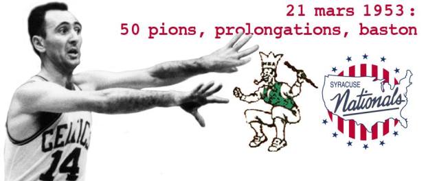 Quatre prolongations, 107 fautes, affrontement entre joueurs et policiers, Bob Cousy à 50 points… Le moins que l’on puisse dire est que cette rencontre des playoffs 1953 entre Boston Celtics et Syracuse Nationals n’aura pas été un match comme les autres.
