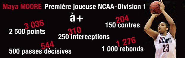 Suivent trois année de disette sans Final Four et une âpre bataille face à Tennessee durant l’été 2007. L’enjeu est le recrutement de la numéro 1 des lycéennes, Maya Moore. Moore choisit UConn après une prise de contact illégale aux yeux de la NCAA (une visite du campus ESPN). La puissante organisation reste sourde à la plainte de Tennessee et s’abstient de sanctionner UConn. Aux côtés de Tina Charles et de Renee Montgomery, Moore ramène l’équipe au Final Four 2008 où elles échouent en demi-finale contre les Cardinals de Stanford. Elles ne se doutent pas que c’est alors la dernière défaite avant longtemps. les Huskies ne chutent qu’en décembre 2010 face au même Cardinals après une série de 90 victoires, (nouveau record) agrémentée de deux titres. Pourtant, malgré 36 points inscrit par sa star, UConn ne peut franchir l’obstacle Notre Dame en demi-finale du Final Four. C’est donc avec deux trophées, un bilan de 150 V / 4 D et un contrat avec Air Jordan, (une première pour une joueuse universitaire), que se retire Maya Moore en 2011.