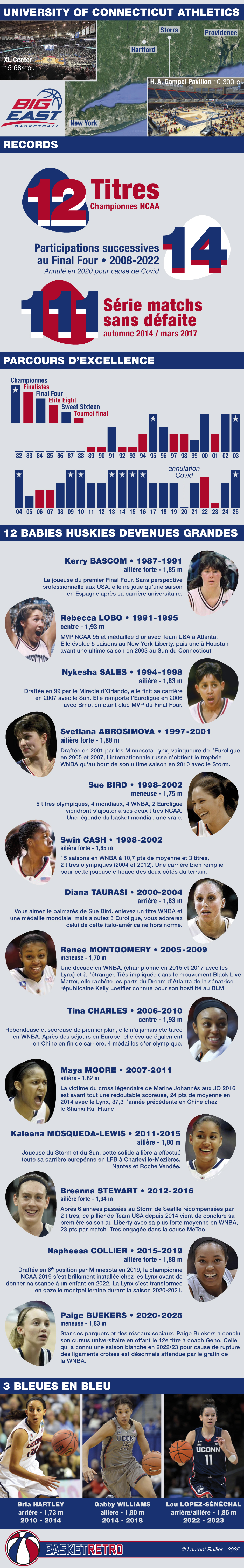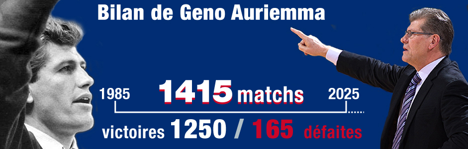 Le sacre de 2016 est le dernier en date. Si les Huskies parviennent malgré tout à atteindre le Final Four à cinq reprises, (hormis en 2020 où le tournoi national est annulée pour cause de COVID), la consécration échappe aux filles du Connecticut. En 2022-23, la perle Paige Buekers est out pour la saison. La déchirure d’un ligament croisé survenue lors d’un match de préparation l’exclut des parquets et pour la première fois depuis 2008, UConn est privé de Final Four. Elle revient la saison suivant et la routine du F4 est respectée. Mieux, en 2025, Paige offre à son coach mentor un 12e titre. Pour elle l’avenir se dessine en WNBA, mais Azzi Fudd, MVP des Finals, est prête à assumer le rôle de cheffe de meute pour le plus grand bonheur du musher Auriemma.