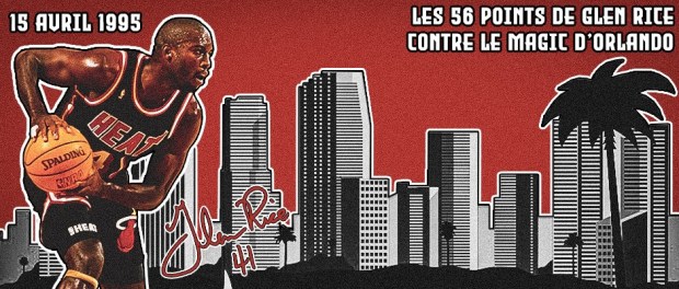 En effet le 15 avril 1995, Glen Rice a ainsi explosé les compteurs contre les futurs finalistes NBA en la personne du Magic d’Orlando de Penny Hardaway et de Shaquille O’Neal. Il inscrit 56 points à 20 sur 27 aux tirs dont un excellent 7 sur 8 à trois-points. Les 38 points et 16 rebonds du Shaq et les 28 points et 18 passes de Penny Hardaway n’ont donc pas suffi puisque le Heat s’est imposé sur le score de 123-117.
