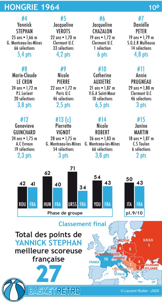 Le troisième match offre l’adversaire cauchemardesque, les ogresses soviétiques de la géante Salimova, 2,01 et de la « meilleure joueuse du monde », la lettonne Skaidridite Smildizina, capable de jouer aussi bien à l’intérieur que sur les ailes du haut de son 1,90 m. Chazalon a beau se démener, 9 pts, la note est sévère, 34/71. Le dernier match de la phase de groupe n’apporte guère plus satisfaction au clan tricolore en se soldant par une nouvelle défaite contre la Yougoslavie, 43/54. La France n’a plus qu’un match à jouer contre la nation fannie de l’autre groupe, l’Italie. Et même là ça ne passe pas. Vaincues 43/50, les Bleues terminent donc sans aucune victoire à la dernière place d’un tournoi qui s’achève une fois de plus par l’Union Soviétique sur la plus haute marche du podium après avoir battu dans la difficulté une belle équipe Bulgare. La Tchécoslovaquie s’empare de la médaille de bronze aux dépends de ces Roumaines qui nous avaient battus que d’un petit point le premier jour.