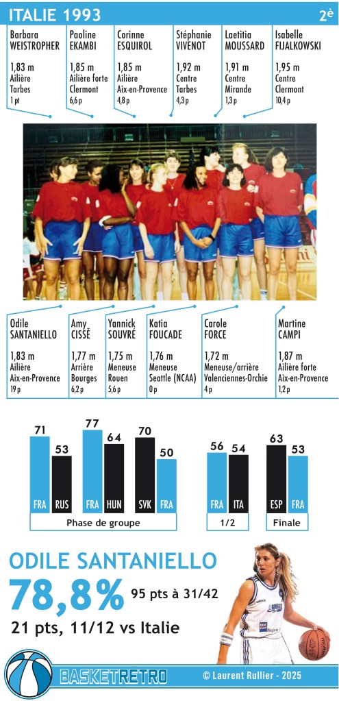 La France aura lors de cet EuroBasket 1993 remporté sa seconde médaille en argent dans le cadre de cette compétition. Au delà du résultat, elle symbolisera le trait d’union entre deux générations et viendra poser les fondations des succès à venir de l’équipe de France féminine.