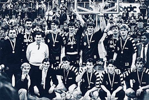 Gardant son numéro 14, le gaucher débarque en même temps qu’un certain Vlade Divac, 18 ans seulement mais a la barbe déjà fournie. Ivo Nakić (20 ans), double vainqueur de l’Euroleague avec le Cibona Zagreb et qui agrémentera son palmarès d’un troisième trophée en 1992 avec le Partizan fait également partie de la bande. Pour la petite anecdote, son fils Mario est actuellement basketteur et évolue au… Partizan. Tout ce beau monde retrouve dans l’équipe quelques futurs beaux noms du basket yougoslave. A savoir le meneur de 19 ans et avec des cheveux, Aleksandar Djordjević, le pivot Slaviša Koprivica (18 ans) et le meneur Vladimir Dragutinović (19 ans). Cette brochette de gamins est entourée par quelques « vieux » à peine plus âgés avec les pivots Goran Grbović (25 ans), Milenko Savović, décédé en 2021 et un certain Željko Obradović, 26 ans pour ces deux derniers. Une moyenne d’âge de 20 ans, des pépites en devenir et une équipe dont le caractère s’affirme. Le cocktail est idéal sur le papier mais a du mal à se mettre en route au début. Ce qui coûte fatalement son poste au coach principal, remplacé par son adjoint Vujošević. Dès lors, à partir de ce changement de perspective, le Partizan de Paspalj termine finalement à la deuxième place de la phase régulière, derrière le Cibona d’un certain Dražen Petrović, meilleur marqueur du championnat avec moyenne de points de 37 unités. A partir des quarts, le Zadar puis le Bosna sont défaits tour à tour et une victoire (2-0) face au rival de l’Étoile Rouge permet aux blancs et noirs d’être titrés pour la quatrième fois de leur histoire en finale des playoffs.