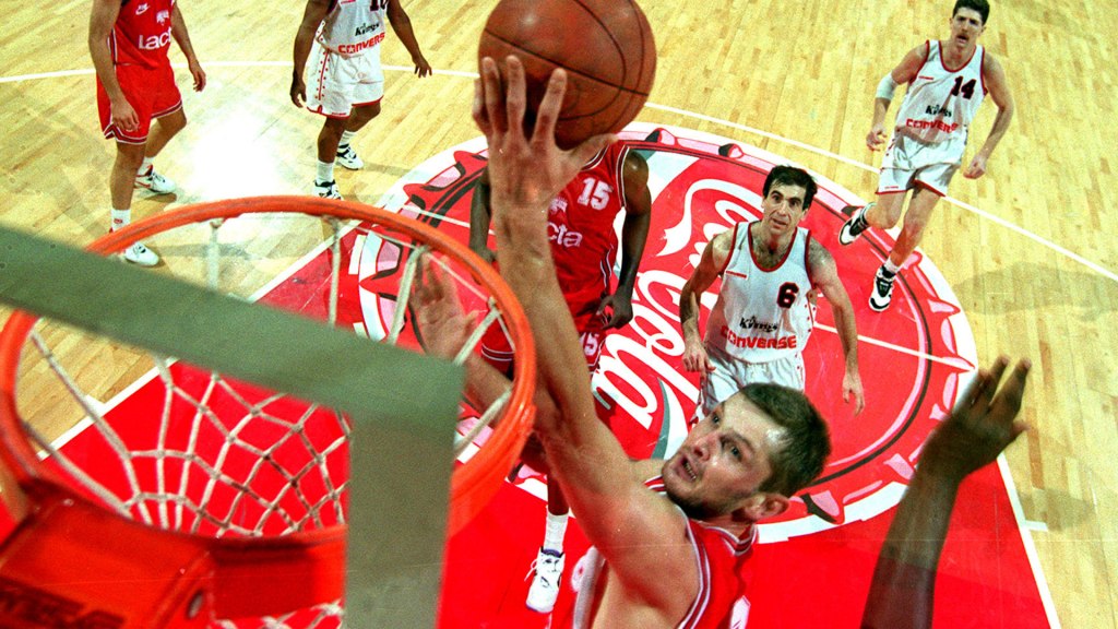 Effectivement, la saison suivante (1992/1993) Paspalj fait le « back-to-back » grec avec Fasoúlas et Roy Tarpley (décédé en 2015) comme nouveaux partenaires. La saison 1993/1994 est encore plus idyllique au niveau local avec un championnat obtenu en finale face au PAOK, une Coupe de Grèce glanée face à Iraklis, à domicile, au Pirée. Seule anicroche, la finale d’Euroleague perdue 59-57 face à la Joventut Badalona. Après avoir défait leur ennemi héréditaire du Panathinaïkós en demi, les Grecs pensaient certainement avoir fait le plus dur au niveau émotionnel. Maigre consolation cependant, Paspalj obtient le titre de MVP de la saison en Europe et rafle également tous les trophées de MVP sur la scène nationale grecque. Une année faste pour le Yougoslave malgré la tragédie que traverse son pays avec la guerre qui s’enlise. Toujours est-il que le changement, c’est maintenant et la saison 1994/1995 voit le numéro 8, désormais âgé de 28 ans, quitter le Pirée pour aller vers le… Panathinaïkós. Du vert au rouge, la différence est mince mais pouvait-on dire non au plus Grec des Américains (avec Telly Savalas de Kojak) ? Pour sa dernière saison, l’immense Nikos Galis, 37 ans, voit arriver un pourvoyeur de ballons pour une ultime mission. Dès lors se forme un quatuor, certes âgé, mais de folie avec le pivot Croate, Stojan Vranković (30 ans). Ce dernier, pour l’anecdote deviendra à Paris, en 1996, l’idole de tout le peuple vert en sprintant du haut de ses 2m17 pour contrer un joueur de Barcelone allant au panier, en finale d’Euroleague. En attendant, avec Panagiotis Giannakis (35 ans), le quatuor se forme pour tenter de donner une belle sortie à la légende grecque. Ajoutons enfin, une autre (future) légende, avec la présence dans l’effectif du futur capitaine du « Pana », période Euroleague glanés, Frangískos Alvértis, 20 ans.