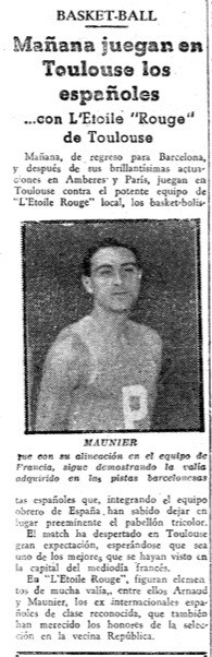L’Espagne malgré la guerre civile envoie tout de même une équipe aux olympiades ouvrières d’Anvers en 1937. Cette compétition rassemble alors les différentes fédérations travaillistes dont la FSGT et les Espagnols vont se distinguer. Toujours entraînée par Mariano Manent, l’équipe d’Espagne s’impose en finale face à la France et décroche le titre. Quelques jours plus tard sur le chemin du retour, les Espagnols sont conviés à Toulouse pour un match de gala en soutien aux réfugiés espagnols. Ironie de l’histoire, l’Espagne affronte l’Étoile rouge de Toulouse d’Armando Maunier. Les Toulousains viennent à bout d’Espagnols fatigués, 34 à 23.