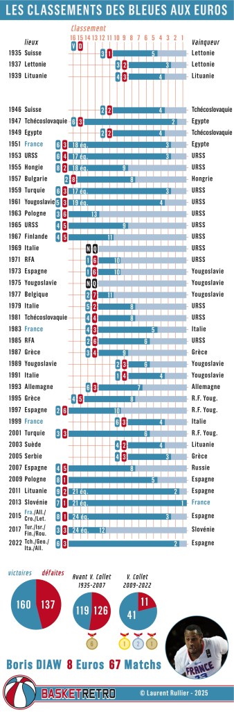 En 1935 au delà de la cinquième place, on a déjà le mérite d’être là, d’être l’une des 10 nations européennes présentes en Lituanie, celles où l’on joue au basketball. On a même une identité de jeu que le journaliste de l’Auto, Gilbert Bideau, appelle en 1937 le « ripopo », un jeu un peu décousu mais spectaculaire basé sur la vitesse et la circulation de balle rapide. Par contre la tactique collective est aux abonnés absents. C’est quand même avec un jeu un plus structuré par Busnel puis Buffière que les années 50 nous voient parvenir à tenir tête aux pays du Pacte de Varsovie et a être leader de « l’Europe de l’Ouest ». La belle quatrième place à l’Euro 1961 en Yougoslavie marque la fin du premier cycle. Si l’on fait une moyenne des classement entre 1935 et 1961, la France se situe entre la quatrième et cinquième place européenne. 5 médailles de bronze.
