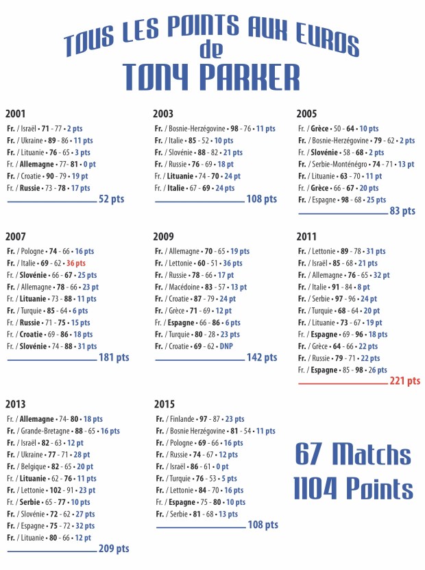 Un Eurobasket en France, pour son huitième championnat européen depuis ses débuts en 2001 : L’occasion est belle de laisser son nom tout en haut de la hiérarchie. Il occupe à ce stade la seconde place des meilleurs marqueurs du tournoi. Après un match âprement disputé, Parker (16 points et 3 passes) guide les siens vers une victoire 69 à 66 face aux Polonais. TP devient ce soir là numéro un au classement des meilleurs marqueurs avec un total de 1104 points. Le voilà sur le toit de l’Europe.