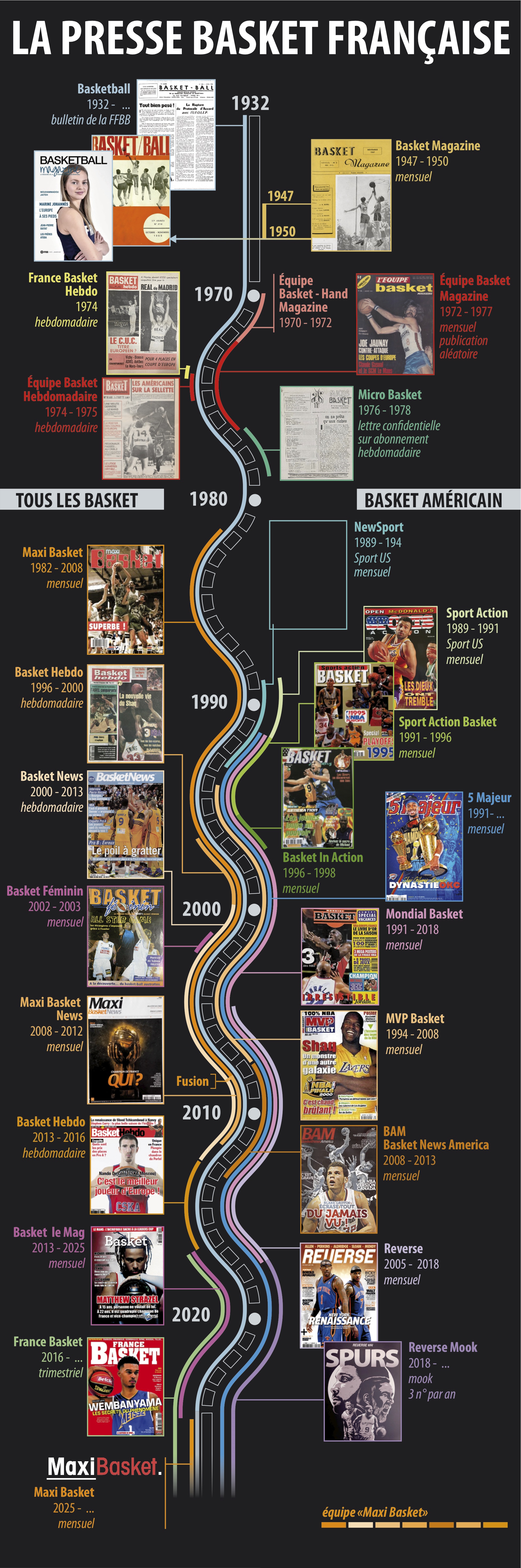 En 1982 ce sont deux jeunes journalistes manceaux issus de la presse quotidienne régionale qui tentent le pari fou de lancer un mensuel basket. En parfaits indépendants sans soutien d’un groupe de presse, Didier Le Corre et Pascal Legendre s’improvisent directeur de la publication, maquettiste et diffuseur de Maxi Basket. Ils seront rejoints par Vincent Loriot, Liliane Trévisan et bien d’autres qui formeront le vivier d’un journalisme basket made in France. « Maxi » à l’instar de feu L’Equipe Basket couvre tous les baskets, mais avant tout le basket de proximité. Pour le basket américain, dont la NBA qui fait ses premières apparitions télévisées nocturnes sur la chaîne encore confidentielle Canal + en 1984, on en reste prudemment durant les premières années sur une ligne « pédagogique », comme en témoignent en mai 1986 les sept pages consacrées à la NCAA, véritable « La NCAA pour les nuls ». Larry Bird est le premier joueur NBA à avoir les honneurs de la couverture en décembre 1984. C’est un véritable risque éditorial pour la jeune rédaction qui préfère miser sur des Richard Dacoury, Ed Murphy ou Freddy Hufnaguel pour séduire son lectorat. Il faut dire que couvrir le basket étranger exige de faire preuve d’astuce et de pugnacité. Cela passe par des abonnements aux confrères espagnols et italiens et le système D pour se procurer les guides annuels des franchises de la Grande Ligue. Chercher l’info avant de la retransmettre est un véritable sacerdoce dans ces années pré-internet. Le mensuel accompagne la professionnalisation et la structuration du basket national en devenant son média de référence durant trois décennies. En 1996, afin de traiter l’actualité immédiate, celle des journées de championnat et de ses stats, Le Corre et Legendre offrent à Maxi un petit frère, un hebdomadaire, Basket Hebdo.
