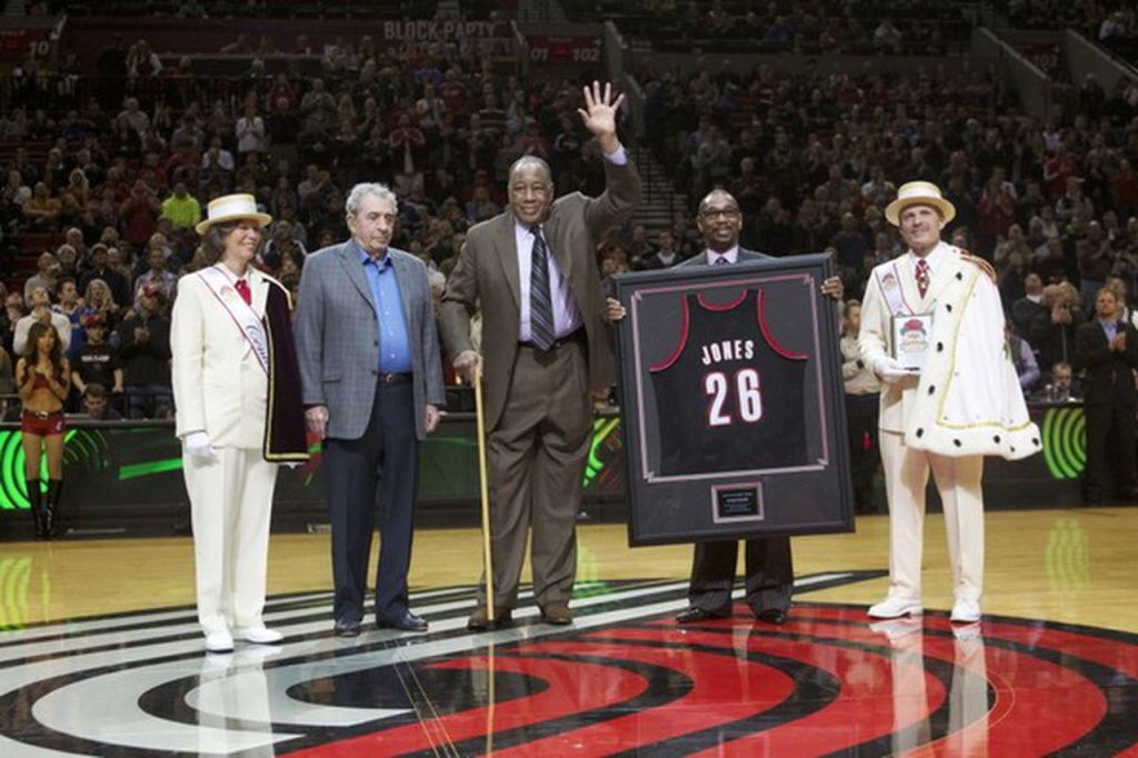 Les Trail Blazers honorent « Snapper » en mars 2012 au centre du parquet du Rose Garden. Un maillot encadré de l’équipe, floqué du numéro 26, le nombre d’années passées par Jones derrière les micros pour la franchise, lui est offert.