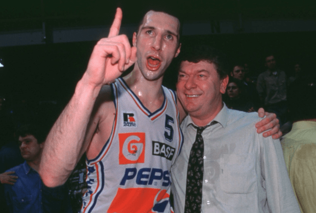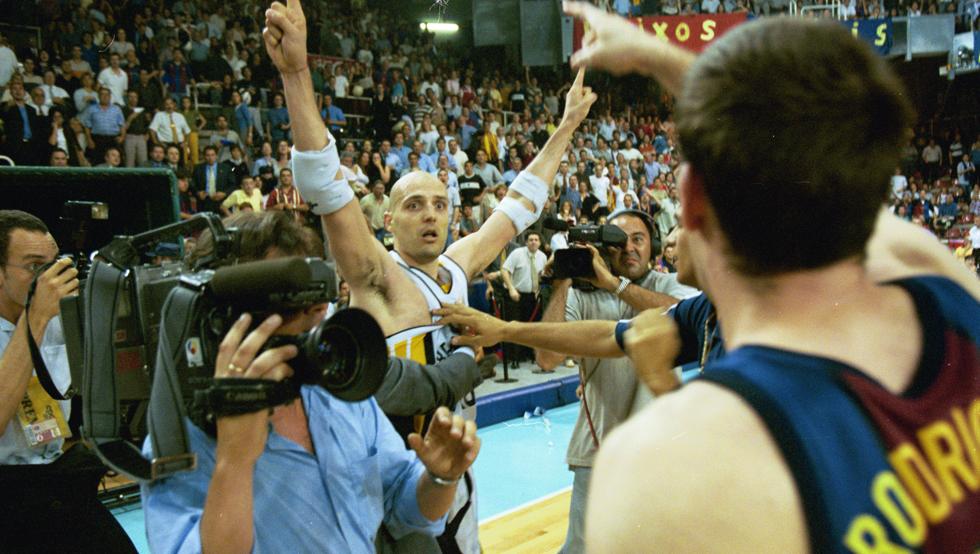 C’est au coup de sifflet final de cette rencontre que se jouera l’une des scènes les plus cocasses de l’histoire de la Liga Espagnole: Non renouvelé et laissé libre la saison précédente par Barcelone qui lui préfère l’américain Anthony Goldwire, Sacha Djordjevic a viré de bord et s’est retrouvé, un peu malgré lui, obligé d’aller exporter son talent chez les merengues. Quelle plus belle revanche alors pour lui que de remporter le titre sur le terrain du club qui ne lui a pas fait confiance? Euphorique donc, c’est du rond central du Palau Blaugrana qu’ Aleksandar lève les bras au ciel au bon souvenir des dirigeants qui l’ont snobé quelques mois auparavant. Furieux devant un tel manque de respect, Nacho Rodriguez, (aujourd’hui directeur sportif du Barça), fonce sur Djordevic et lui extorque d’aller se cacher pour exhiber sa joie! Culte.